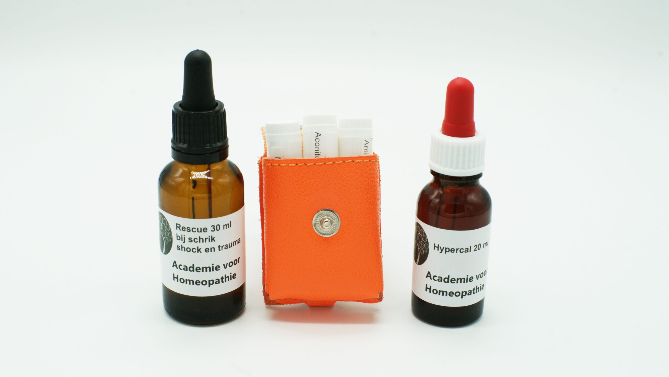 3 homeopathische EHBO middelen C30 korrels in leren etui + 20 ml Hypercal + 30 ml Rescue